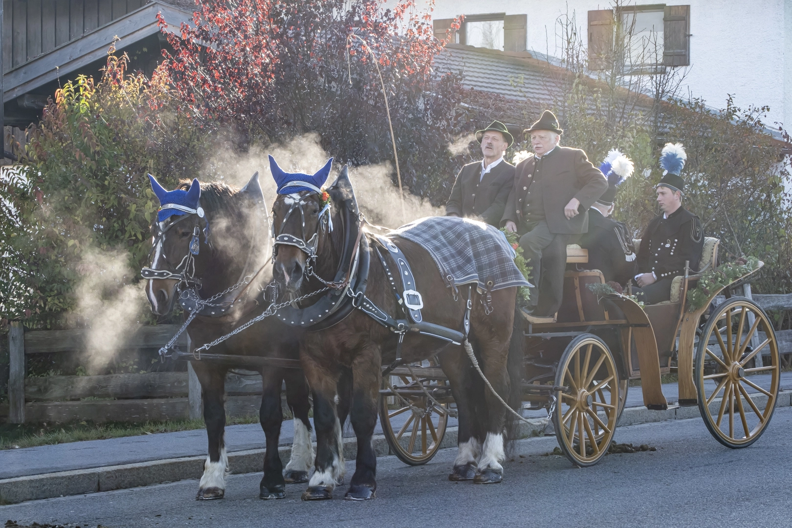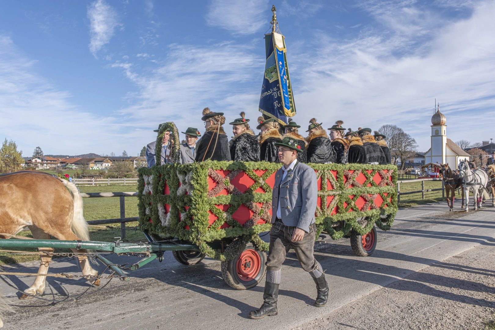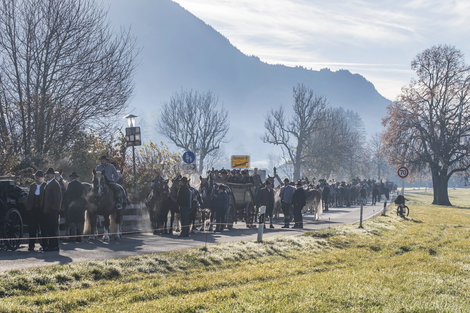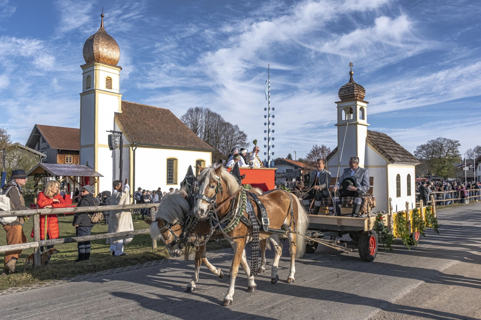 Die Prozessionen zu Pferde finden zu Ehren des heiligen Leonhard von Limoges (6. Jahrhundert) Anfang November statt. Als Schutzpatron der Nutztiere, vor allem der Pferde, werden Wallfahrten mit Tiersegnung unternommen. Wir fahren nach Hundham, die Morgennebel lösen sich gerade auf, die Pferde dampfen noch in der Kälte. Die 60 festlich herausgeputzten Gespanne drehen zwei Runden, erhalten dann die Segnung und versammeln sich vor der Leonhardikapelle. 09.11.2024